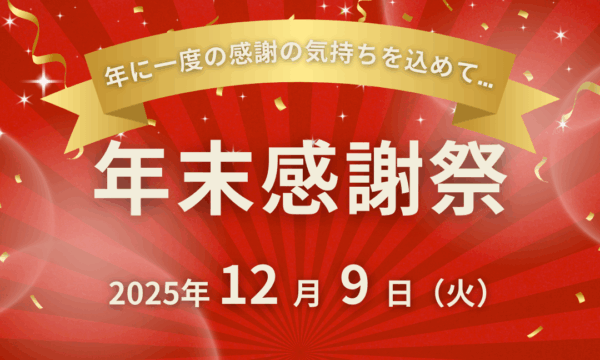 令和7年12月9日(火) 開催 令和7年12月9日(火)【一年の感謝の気持ちを込めて…】年末感謝祭 開催のご案内 一年の締めくくりに相応しいい豪華賞品を多数ご用意いたします。蜷様のご参加お待ちしております。 担当からのコメント 一年の締めくくりに相応しいい豪華賞品を多数ご用意いたします。仲間やご家族と楽しいひとときをお過ごしください。