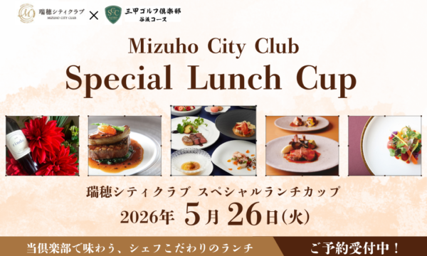 令和8年5月26日(火) 開催 令和8年5月26日(火)【瑞穂シティクラブプレゼンツ】スペシャルランチカップ ゴルフと、少し贅沢で上品なお食事を心ゆくまでお楽しみいただけるオープンコンペです。この日のためにシェフが趣向を凝らしたスペシャルランチをご提供いたします。 担当からのコメント 瑞穂シティクラブのシェフが趣向を凝らしたスペシャルランチをぜひご堪能ください。